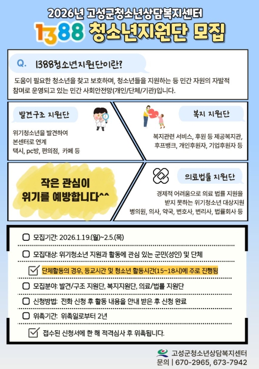 ![]() 고성군청소년상담복지센터 1388청소년지원단 모집 |