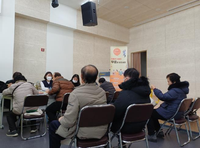 ![]() 금산군치매안심센터 시니어클럽 노인공익활동 참여자 대상 치매선별검사 모습 |