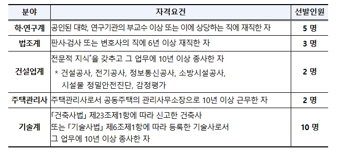 하자심사·분쟁조정위원회 제9기 위원 모집은 학·연구계, 법조계, 건설업계, 주택관리사, 기술계(건축사, 기술사) 5개 분야별 전문가를 대상으로 한다.