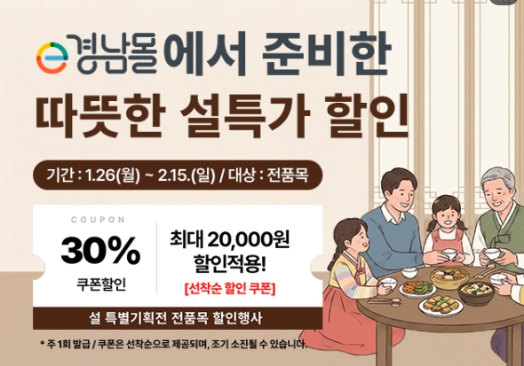 이번 기획전은 명절 선물 세트를 포함한 e경남몰의 모든 상품에 30%(최대 2만 원) 할인 혜택을 제공하며, 입점 업체별로 자체 할인 행사도 함께 진행돼 실제 구매 시 적용받는 할인 혜택은 더 크다.