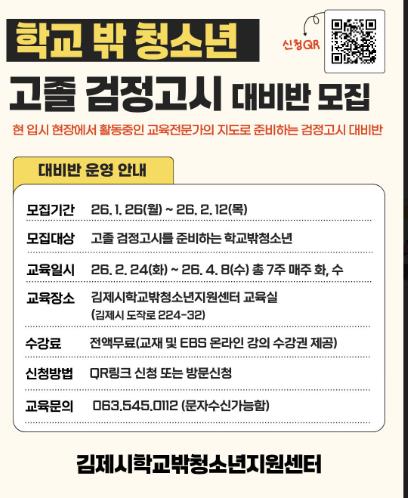 ![]() 김제시학교밖청소년지원센터, 2026년 검정고시 대비반 모집 |