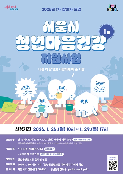 ![]() 2026년 서울시 청년 마음건강 지원사업 1차 모집 포스터 |