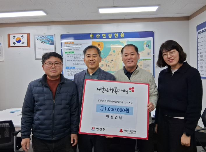 양정우 변산면장은 “매년 아름다운 나눔을 통해 이웃 사랑을 실천해 주시는 정상열 이장께 깊이 감사드린다”며 “기부금 활성화를 통해서 모금된 성금을 통해 맞춤형 복지 지원에 힘쓰겠다”고 고마움을 전했다.
