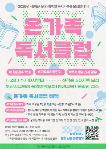 ![]() 부산시민도서관, ‘온가족 독서클럽’ 참여 가족 모집 |