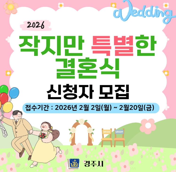 경주시는 2019년부터 2025년까지 총 23쌍의 신혼부부를 지원했으며, 2026년에는 5쌍을 선정해 결혼식 준비 비용을 최대 300만 원까지 지원할 예정이다.