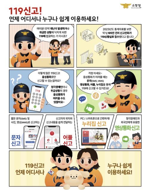 특히 청각·언어 장애인, 소음이 큰 장소, 위험 상황으로 통화가 곤란한 경우 등에서는 다매체 신고를 활용하면 보다 효과적인 신고가 가능하다. 신고 방법은 △문자(119) △119 신고 앱을 통한 사진·영상 첨부 △영상통화 신고 등이다.