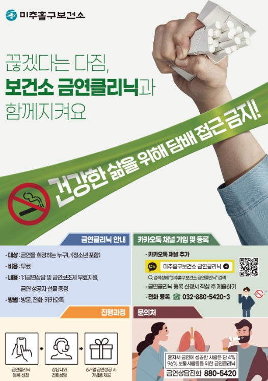 한편, 금연 클리닉 참여를 희망하는 주민은 미추홀구 보건소 금연 클리닉으로 문의하면 자세한 안내를 받을 수 있다.