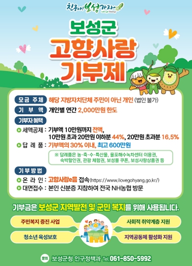 ![]() 보성군-담양군, 고향사랑 교차 기부로 싹튼 상생의 정_고향사랑기부제 포스터 |