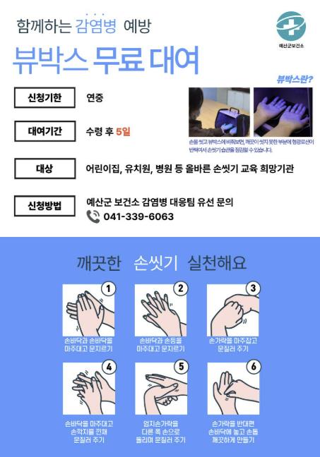 장비 대여를 희망하는 기관은 최대 5일간 뷰박스를 이용할 수 있으며, 신청과 관련한 자세한 사항은 보건소 감염병대응팀(041-339-6063)을 통해 안내받을 수 있다.