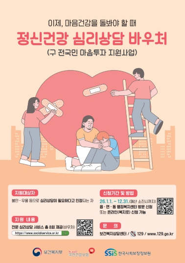 정신건강 심리상담 바우처 사업은 우울·불안, 스트레스 등 심리적 어려움을 겪는 시민에게 전문가와의 1:1 대면 심리상담 서비스를 바우처 형태로 지원하는 제도다. 치료 이전 단계에서 마음 상태를 점검하고, 증상이 악화되기 전 전문적인 개입을 통해 정신질환을 예방하는 데 목적이 있다. 대상자로 선정되면 120일 동안 총 8회의 심리상담 서비스를 이용할 수 있다.