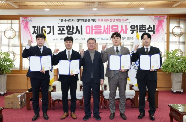 ![]() 포항시는 지난달 30일 시청 대외협력실에서 ‘제6기 포항시 마을세무사’ 신규 위촉자에 대해 위촉장을 전달했다. (왼쪽부터 전배승·이재욱 세무사, 장상길 부시장, 한지웅·김광재 세무사) |