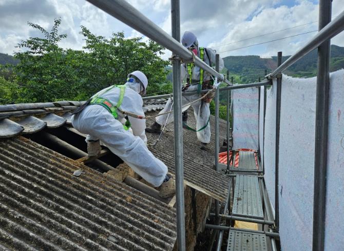 ![]() 지난해 추진된 슬레이트 처리지원사업의 창고 슬레이트 지붕 철거 현장 모습 |