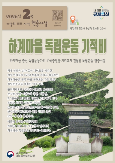 ![]() 경북북부보훈지청, 2월 이달의 우리 지역 현충시설 안동시 ‘하계마을 독립운동 기적비’ 선정 |