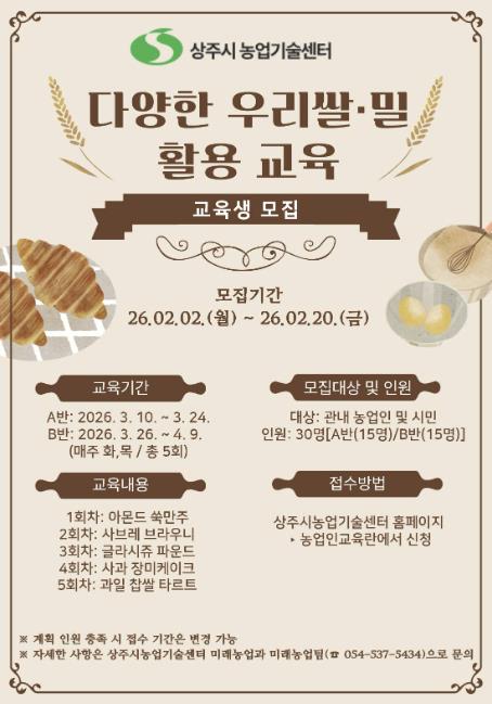 ![]() 상주시상주시, 2026년 『다양한 우리쌀·밀 활용 교육』 교육생 모집농업기술센터 |