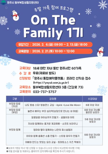 모집 대상은 18세 이하 자녀를 동반한 원주시민 60가족이다. 수강료는 무료며, 재료비는 본인 부담이다.