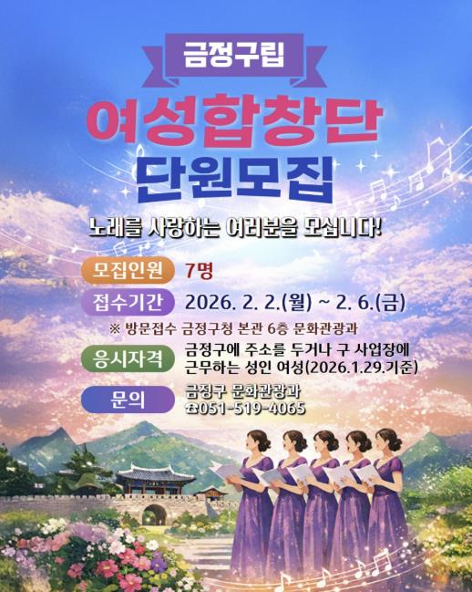 ![]() 부산 금정구, '노래를 사랑하는 여러분을 모십니다' 금정구립 여성합창단 단원 모집 |