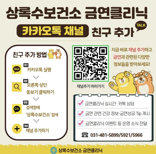 ![]() 상록수보건소 금연클리닉 카카오톡 채널 친구 추가 안내 디지털 홍보자료. |