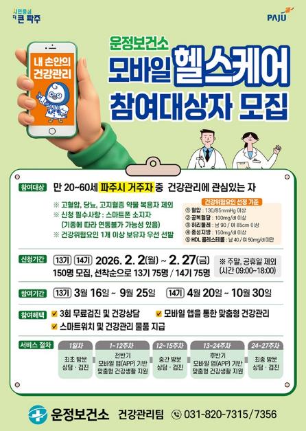 ![]() ‘일상 속 건강관리’ 파주시 운정보건소, 2026년 ‘모바일 헬스케어’ 참여자 모집 |