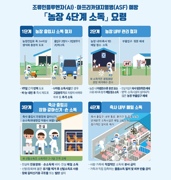 ![]() 조류인플루엔자(AI)·아프리카돼지열병(ASF) 예방 농장 4단계 소독 요령' 안내문 |