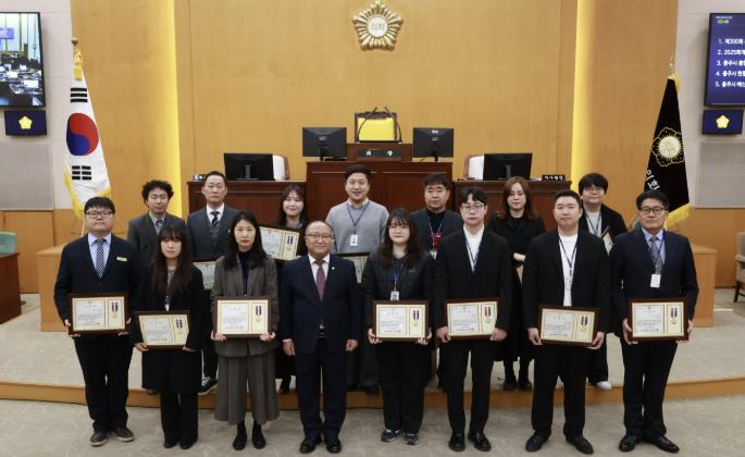 충주시의회는 2025년 행정사무감사에서 모범적인 업무 수행과 창의적인 개선 노력을 보여준 공무원들을 부서 추천과 공적심사위원회 심의를 거쳐 우수공무원으로 선정했다. 선정된 공무원들은 재해복구(DR)시스템 개선 구축, 새로운 징수 기법을 통한 체납액 징수, 관광객 유치 사업 개선 등에서 높은 평가를 받았다.