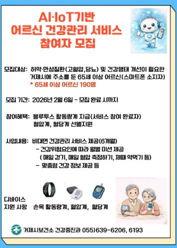 ![]() 거제시보건소, 2026년 AI·IoT기반 어르신 건강관리사업 참여자 모집 |