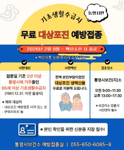 ![]() 2026년 통영시 무료 대상포진 예방접종 실시 |