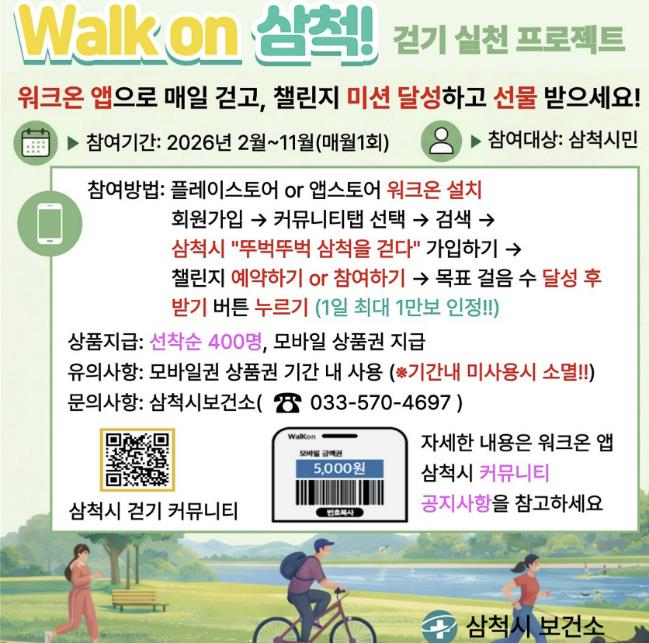워크온 걷기 챌린지는 스마트폰 앱을 통해 시민들이 손쉽게 참여할 수 있도록 기획됐다. 참여자는 플레이스토어 또는 앱스토어에서 워크온을 설치한 뒤 삼척시 공식 커뮤니티 ‘뚜벅뚜벅, 삼척을 걷다’에 가입해 챌린지에 참여하면 된다.