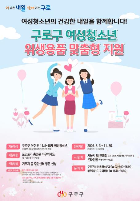 ![]() 구로구 여성청소년 위생용품 맞춤형 지원 안내 포스터 |