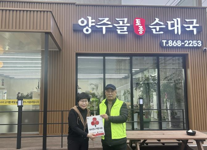 황인용 양주골순대국 대표는 “지역사회에 도움이 될 수 있는 일에 동참하게 되어 뜻깊게 생각한다”라며 매월 정기적으로 관내 취약계층 10가구에 식사를 지원하는 나눔 활동에 참여하겠다는 뜻을 밝혔다.