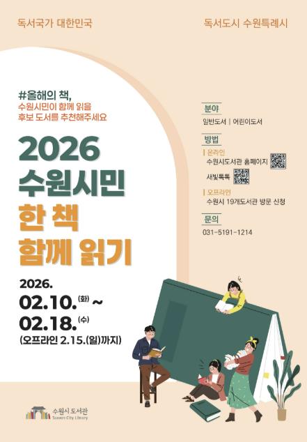 수원시도서관 관계자는 “2026 수원시민 한 책 함께 읽기 사업은 시민이 추천한 책을 매개로 소통하는 독서 운동”이라며 “올해의 책 선정에 시민들이 적극적으로 참여해 주시길 바란다”고 말했다.