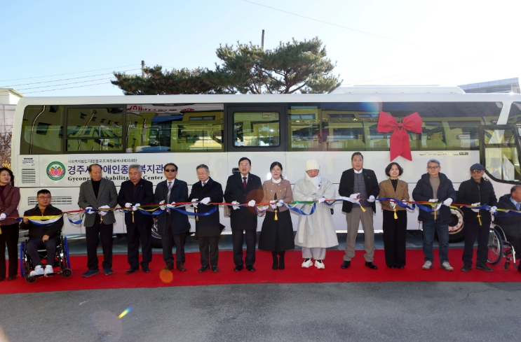 ![]() 주낙영 경주시장(가운데)과 내빈들이 장애인종합복지관 특장버스 도입을 기념하며 테이프 커팅을 진행하고 있다. |