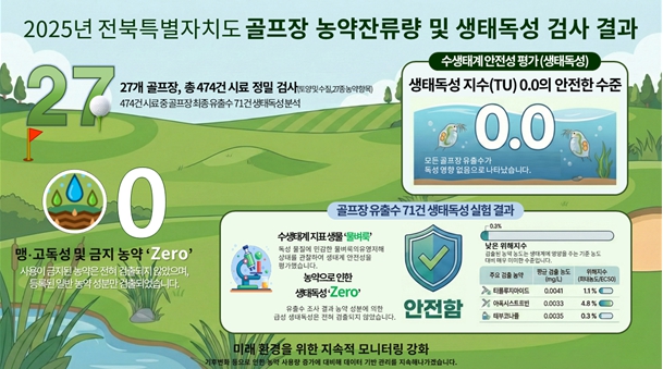 전경식 전북자치도 보건환경연구원장은 “과학적인 검사를 통해 도내 골프장과 주변 환경의 안전성을 지속적으로 확인하고 있다”며 “앞으로도 친환경 생활체육시설 환경 조성을 위해 선제적인 관리체계를 강화해 나가겠다”고 말했다.
