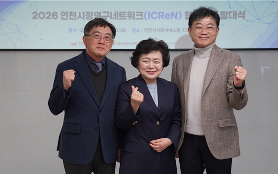 ![]() 조대흥 인천시사회서비스원장과 김정민 인천여성가족재단 대표이사, 이윤호 인천인재평생교육진흥원장이 지난 6일 2026 인천시정연구네트워크 협업연구 발대식을 열고 기념촬영을 하고 있다. |