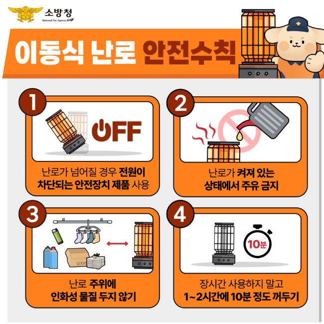 이동식 난로는 연료를 사용하고 이동이 쉬운 구조 특성상 외부 충격이나 전도 시 화재 발생 위험이 높으며, 밀폐된 공간에서는 일산화탄소 중독 사고로 이어질 가능성도 있어 각별한 주의가 필요하다. 특히 다중이용업소, 공연장, 음식점 등 다수 시민이 이용하는 시설에서는 화재 발생 시 대형 인명피해로 확대될 우려가 크다.