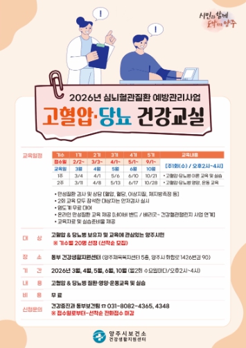 ![]() 양주시 보건소 동부 건강생활지원센터, ‘고혈압·당뇨병 건강교실’ 참여자 모집 |