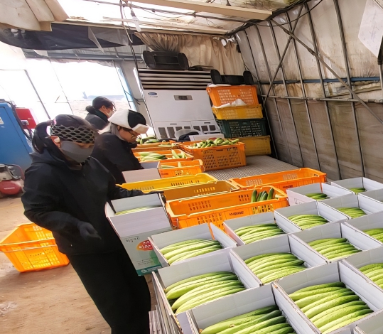 ![]() 천안 하늘그린오이 재배 농가가 수확한 오이를 상자에 담고 있다. |