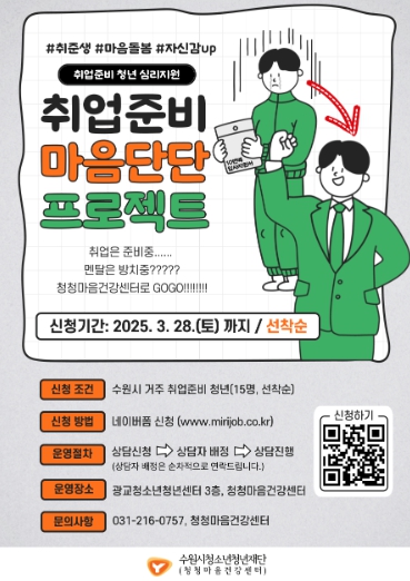 사업 참여는 수원시에 거주하는 취업준비 청년이라면 누구나 신청 가능하며, 선착순으로 15명을 모집한다. 선정된 인원에게는 별도의 자부담 없이 전 과정이 무료로 진행된다.