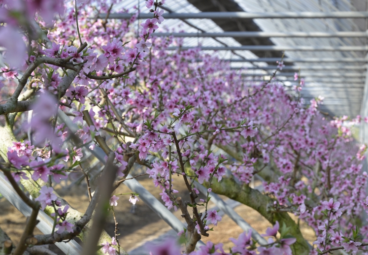 겨울철 한파 속에서도 철저한 보온 및 가온 관리로 안정적인 생육 환경을 유지한 결과, 하우스 내부를 가득 메운 복사꽃이 올해 고품질 복숭아 생산에 대한 기대를 높이고 있다.