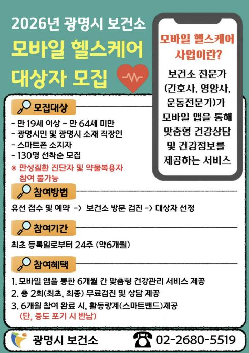 ![]() 2026년 광명시 보건소 모바일 헬스케어 대상자 모집 안내문. |