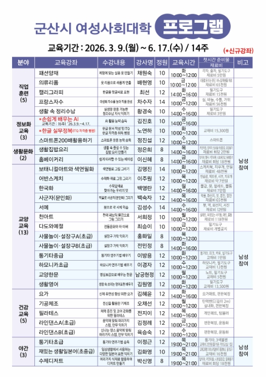 이번 프로그램은 ▲직업훈련 교육(패션양재 등 5개) ▲정보화 교육(손쉽게 배우는 AI 등 3개) ▲생활문화 교육(생활집밥요리 등 2개) ▲교양 교육(보태니컬아트와 색연필화 등 13개) ▲건강 교육(요가 등 5개) ▲야간 교육(통기타초급 등 3개) 분야별 총 31개 강좌가 운영되며, 손쉽게 배우는 AI 등 19개 강좌는 남성 회원도 참여할 수 있다.