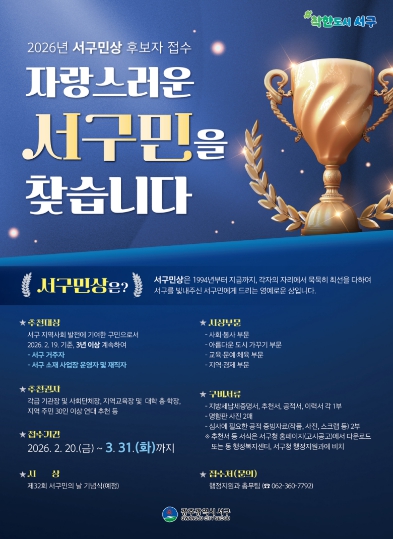 고진희 행정지원과장은 “서구민상은 보이지 않는 자리에서 묵묵히 지역을 위해 헌신해 온 분들을 기리는 상”이라며 “주민 여러분의 적극적인 관심과 추천을 바란다”고 말했다.