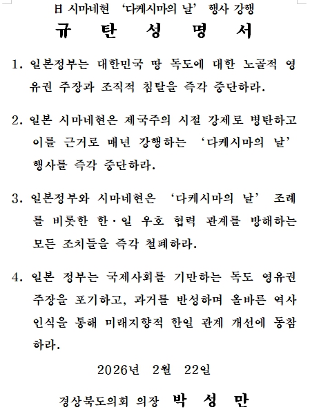연규식 독도수호특별위원회 위원장은 “역사 문제는 왜곡이 아닌 사실과 책임 있는 태도를 통해 다뤄져야 하며, 그렇지 않을 경우 그 부담은 결국 미래 세대에게 돌아가게 된다”고 지적했다. 이어 “대한민국의 주권과 영토에 대한 어떠한 도전도 결코 바람직하지 않다”며 “시마네현은 ‘다케시마 조례’를 폐기하고, 일본 정부 역시 시마네현의 행동이 양국 관계에 미칠 영향을 엄중히 인식해야 할 것”이라고 강조했다.
