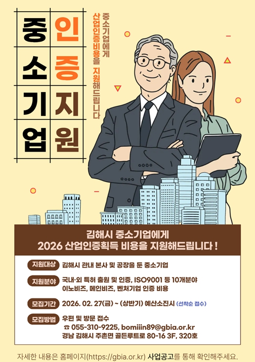 “2026년 김해시 중소기업 산업인증지원사업” 공고는 2월 27일 김해의생명·산업진흥원 홈페이지(사업공고)에서 확인 가능하다.