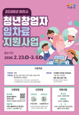 이천시 관계자는 “청년 창업자들이 초기 경영 부담을 덜고 안정적으로 성장할 수 있도록 실질적인 지원을 이어가겠다”라며 “창의적인 아이디어와 열정을 가진 청년 창업자들의 많은 관심과 참여를 바란다”라고 말했다.