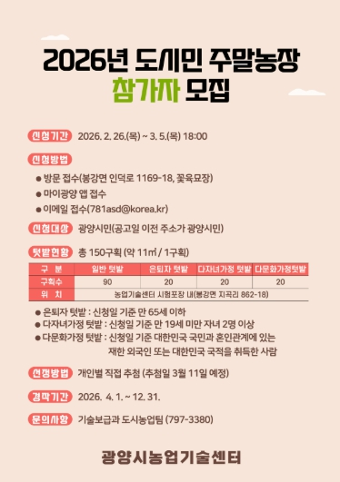 ![]() 광양시, 2026년 도시민 주말농장 참가자 모집 |