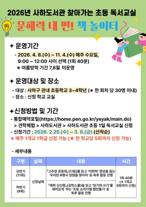 ![]() 2026년 찾아가는 초등 독서교실 ‘문해력 내 편! 책 놀이터’ 프로그램 포스터 |