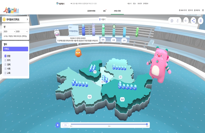 '2025 서울서베이 조사 결과 보고서'는 서울 열린데이터광장 누리집에서 열람 및 내려받을 수 있다. 행복지수, 우리 동네 만족도 등에 대한 3차원 시각화 자료는 서울데이터허브 누리집에서 확인할 수 있다.