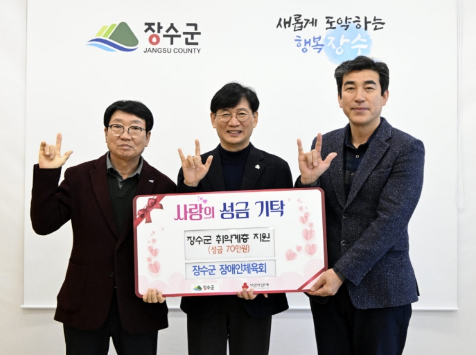 최훈식 군수는 “지역사회를 위한 뜻깊은 나눔에 함께해 주신 장수군 장애인체육회에 깊이 감사드린다”며 “기탁해 주신 성금은 도움이 꼭 필요한 이웃들에게 소중히 전달해 생활 안정에 보탬이 되도록 하겠다”고 밝혔다.