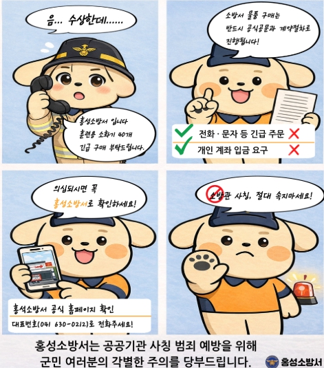홍성소방서는 소방기관에서는 어떠한 경우에도 개인명의 계좌로 물품 대금을 요구하거나 전화로 선입금을 요청하지 않으며, 공식적인 물품 구매는 반드시 공문서와 계약 절차에 따라 진행된다고 강조했다.