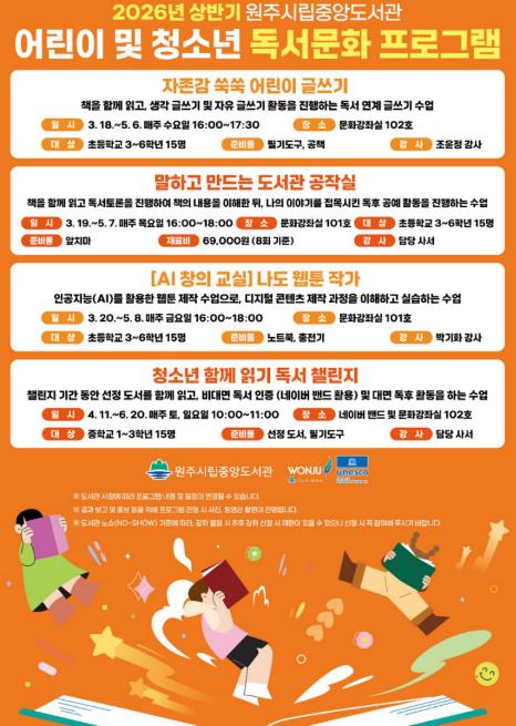 주요 강좌는 ▲독서 기반 글쓰기 수업 ‘자존감 쑥쑥 어린이 글쓰기’ ▲독서토론과 목공예를 결합한 ‘말하고 만드는 도서관 공작실’ ▲생성형 인공지능(AI)을 활용한 웹툰 제작 수업 ‘AI 창의 교실–나도 웹툰 작가’ ▲담당 사서와 선정 도서를 함께 읽고 독후 활동으로 독서를 인증하는 ‘청소년 함께 읽기 독서 챌린지’ 등이다.